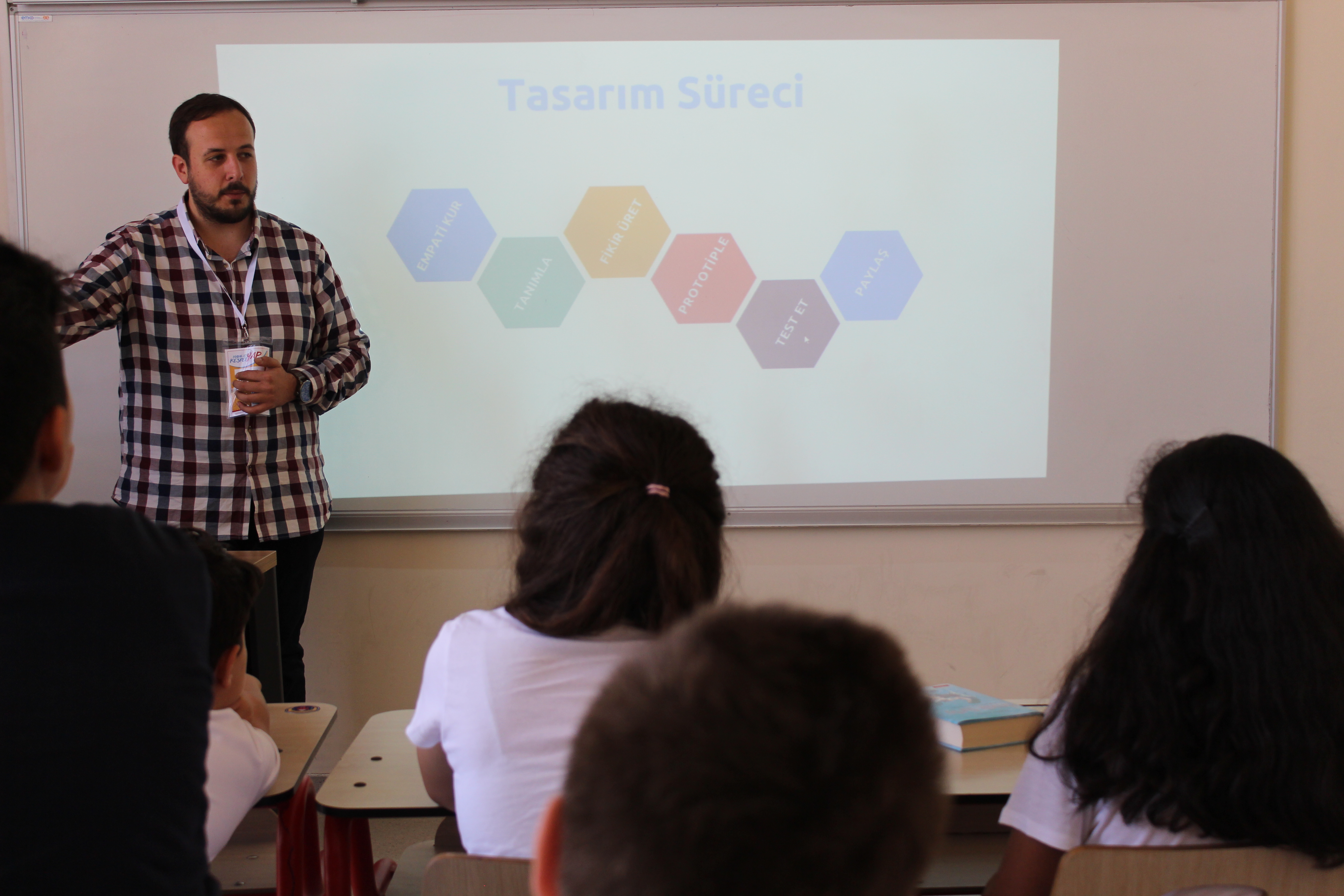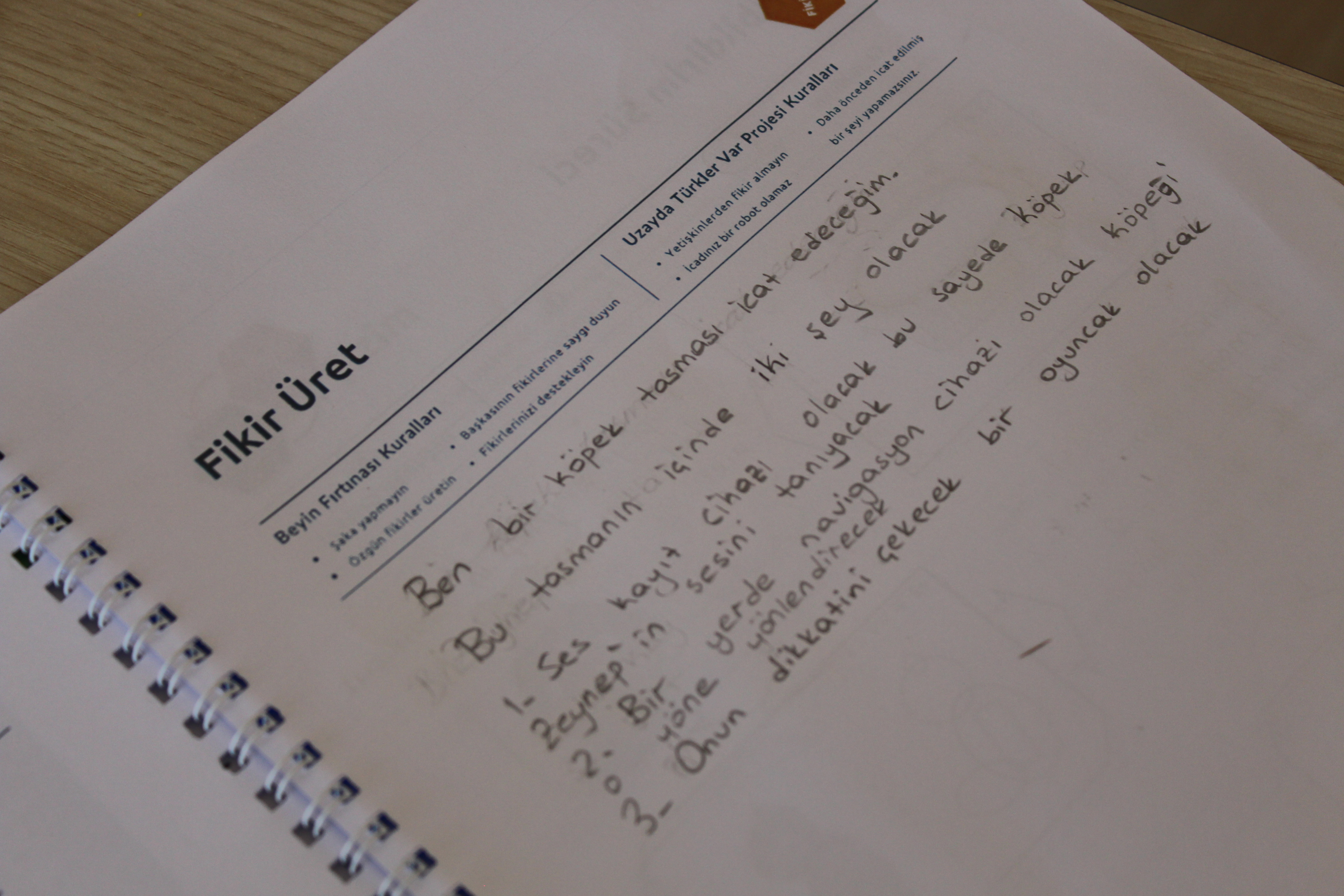 Uzayda Türkler Var atölye çalışmalarında çocuklar icatlarını tasarım süreci aşamalarına göre gerçekleştirdiler.Tasarım süreci Empati Kur – Tanımla – Fikir Üret – Prototiple – Test Et – Paylaş aşamalarından oluşmaktadır. Bu süreç öğrencilere karşılaşacakları toplumsal problemlere karşılık bir tasarım ortaya koyabilme ve ürün geliştirme süreçlerini kazandırmaktadır. Öğrenciler sadece problemi çözmekle kalmıyor, aynı zamanda probleme karşı çözüm yollarını tüm dünya (topluluk) ile paylaşıyor.
