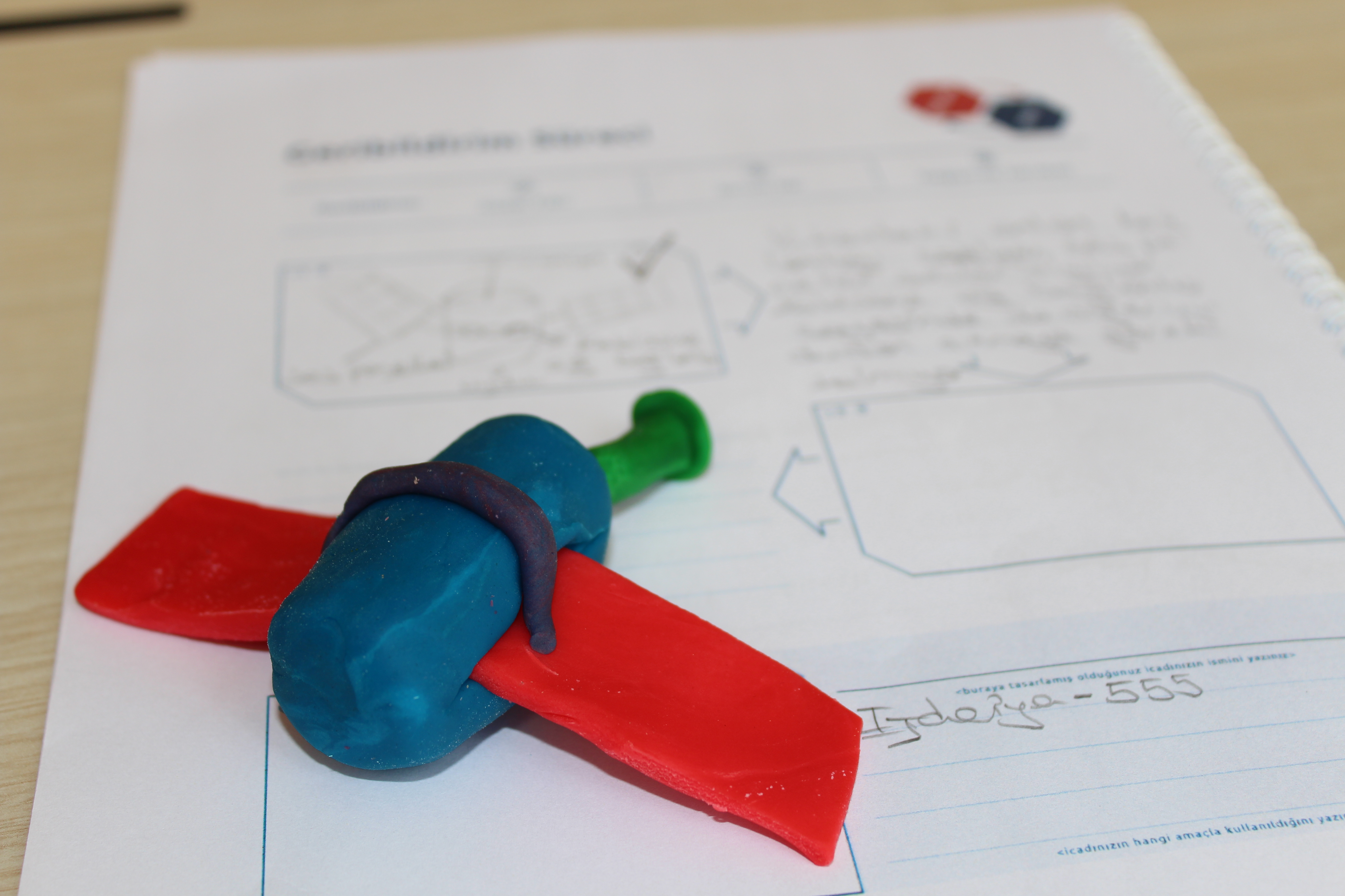 Fikirlerini arkadaşlarıyla paylaşan çocuklar, arkadaşlarından gelen geribildirimlerle prototipleme aşamasına geçtiler. Dağıtılan oyun hamurları yardımıyla icatlarını yapmaya koyulan çocuklar renkli, eğlenceli bir o kadar da öğretici olan bu aşamada birbirinden güzel tasarımlar ortaya çıkardılar.